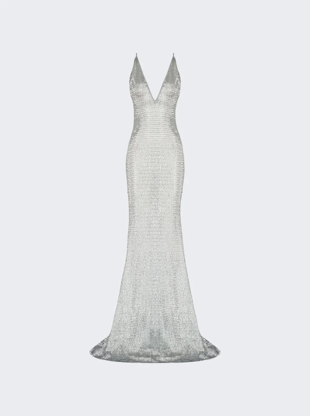 Details - Sleeveless sequined gown - Deep V neck - Backless - Full length Dimensions: Model is 5'9"/175cm and is wearing a size FR36 Composition: 100% Polyester Care: Care according to label Brand Style: NA00302840561 Designer/Brand: THE NEW ARRIVALS ILKYAZ OZEL