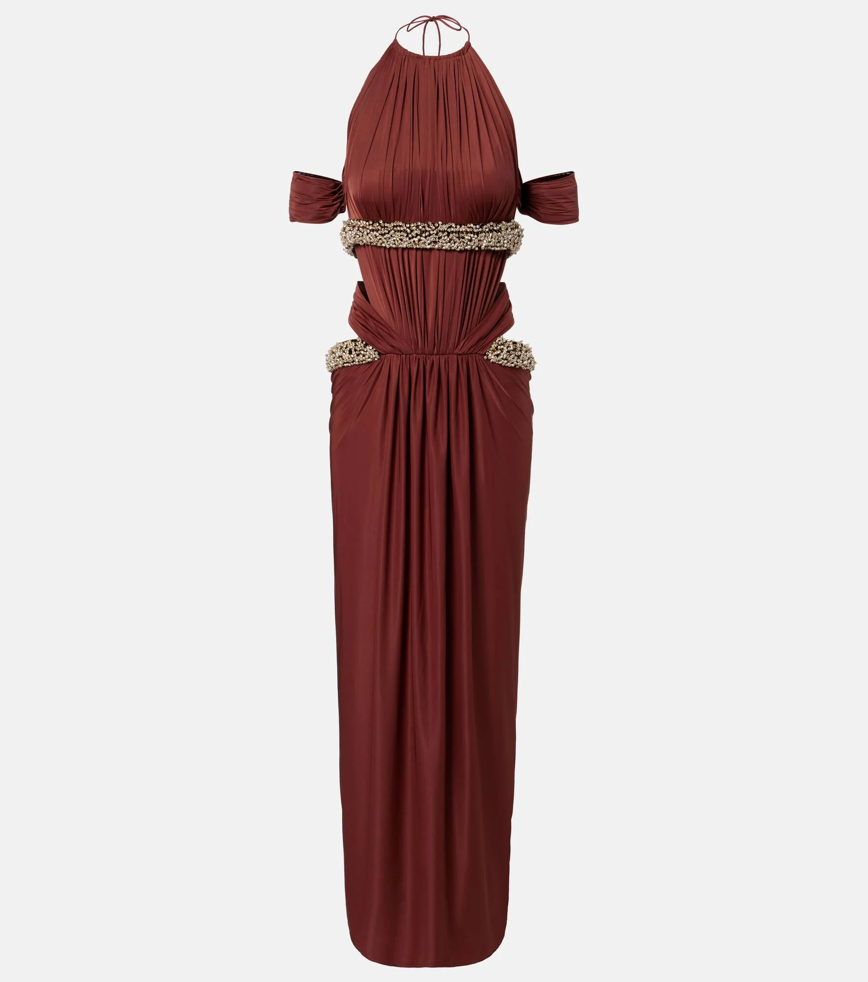 Exude glamour in this gown from The New Arrivals Ilkyaz Ozel. The halterneck design is defined by its open back, sculpted cutouts, and crystal-embellished waistbands. Product Details - Material: 82% polyester, 18% elastane - Care instructions: dry clean - Made in Turkey - Color: brown - Designer color name: Cinnabar - Closure: zipped back - Item number: P01125590 Size & Fit - True to size - Low back - Cinched waist - Slightly stretchy fabric - Medium-cut leg - The model seen in the picture is 178cm-5'10" and wearing a size FR 36