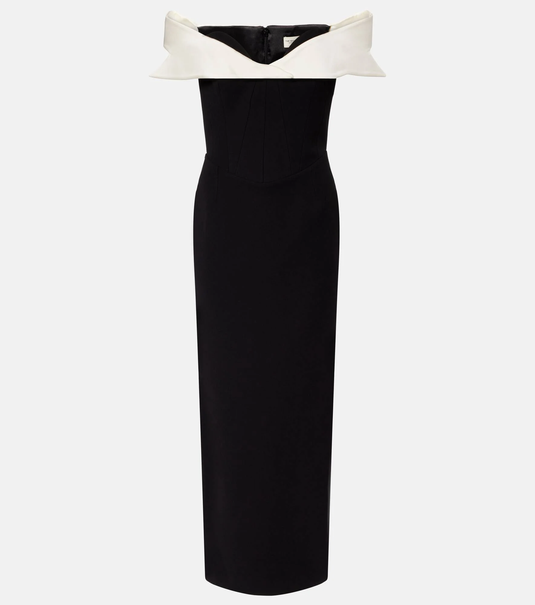 The New Arrivals Ilkyaz Ozel is known for striking silhouettes and details, designed to turn heads at any event. This Jacqueline dress is cut to a form-flattering midi-length fit, complemented by an off-shoulder band in contrast fabric. Product Details - Material: 100% polyester - Care instructions: dry clean - Made in Turkey - Color: black - Designer color name: Dark Matter - Item color: black, white - Closure: concealed zipped back - Boning - Short vent - Item number: P01125742 Size & Fit - True to size - Close fit at the hips - Strapless - Internal boned corset for support - Fitted - Non-stretchy fabric - slit length 34cm-13.5" - The model seen in the picture is 178cm-5'10" and wearing a size FR 36