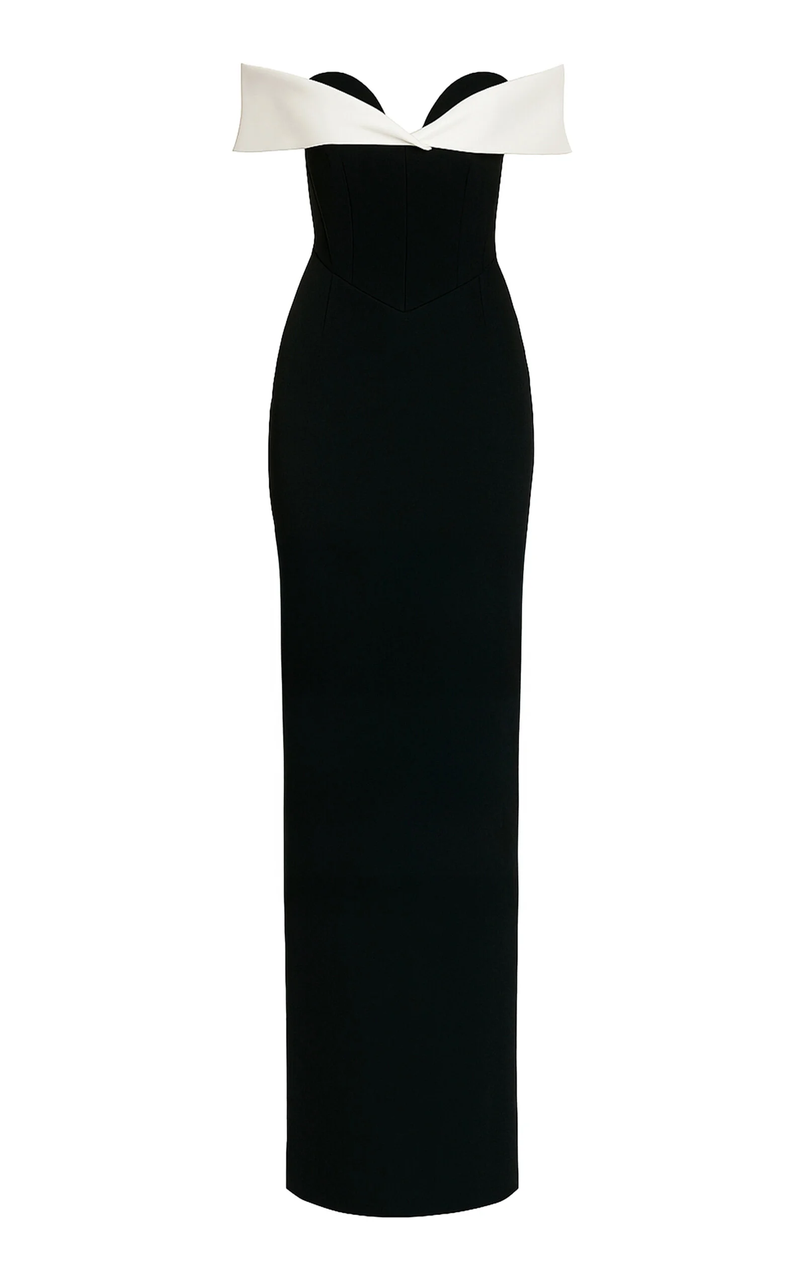 PRODUCT DETAILS - Slim fit, off-the-shoulder neckline, corseted bodice, sheath silhouette maxi - Zip Closure Through Back - Lined - Composition: 100% POLYESTER - Color: BLACK/WHITE - Dry Clean Only - Resort '26