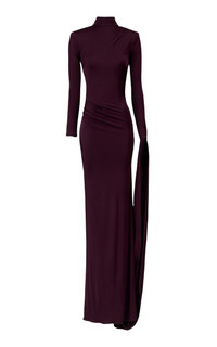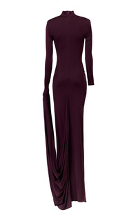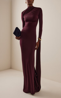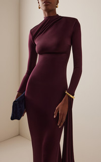 Turkish cool girl İlkyaz Ozel returns with more scintillating party pieces to love. True to form, this season radiates a hedonistic edge across her high-shine signatures that capture a retro glamour. Constructed with jersey, this maxi is designed to fit the frame closely before pooling to a soft train – one that is attached to the sleeve. Add a metallic bracelet to highlight the connection between cuff and hem. PRODUCT DETAILS - Fall/Winter ‘25 - Concealed zip fastening - Composition: 97% viscose, 3% elastane - Dry clean - Designer Color: Devinite - Made in Turkey SIZE & FIT - Our model is wearing a size FR 34 - Model is 5'10" with a 31" bust, 23.5" waist, and 33.5" hip