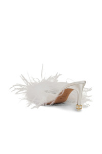 - Ostrich feather upper with leather sole - Made in Italy - Slip-on styling - Leather footbed and lining - Pointed open toe with clear crystal at heel - Approx 90mm/ 3.5 inch heel - Revolve Style No. NARR-WZ6 - Manufacturer Style No. NA0450002-0624
