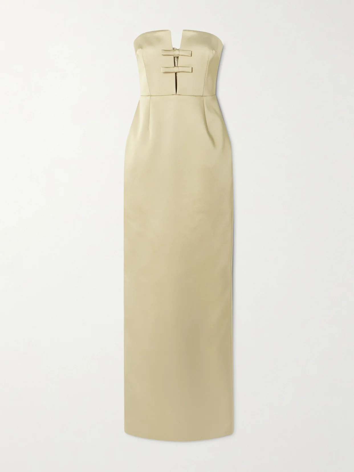 The New Arrivals Ilkyaz Ozel's strapless 'Noa' gown makes a striking, sculptural statement. Made from satin, it has a boned bodice with a plunging slit adorned with dainty bows and falls to a column skirt. Complement the warm shade of ivory with gold jewelry.