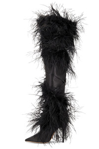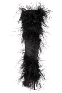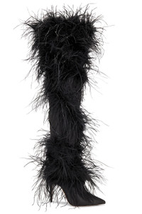 - Ostrich feather embellished satin upper with leather sole - Made in Italy - Pull-on styling - Leather footbed and lining - Pointed toe with stiletto heel - Approx 110mm/ 4.33 inch heel Approx 584mm/ 23 inch shaft Shaft measures approx 21.98" in circumference - Revolve Style No. NARR-WZ11 - Manufacturer Style No. NAO230005-0622