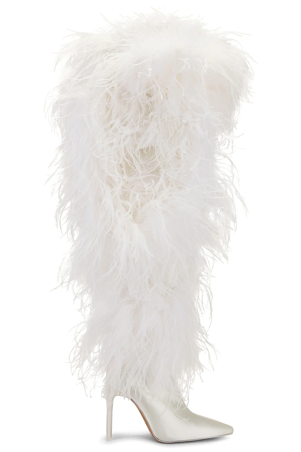 - Ostrich feather embellished satin upper with leather sole - Made in Italy - Pull-on styling - Leather footbed and lining - Pointed toe with stiletto heel - Approx 110mm/ 4.33 inch heel Approx 584mm/ 23 inch shaft Shaft measures approx 21.98" in circumference - Revolve Style No. NARR-WZ7 - Manufacturer Style No. OVERTHEKNEEBOOTS110