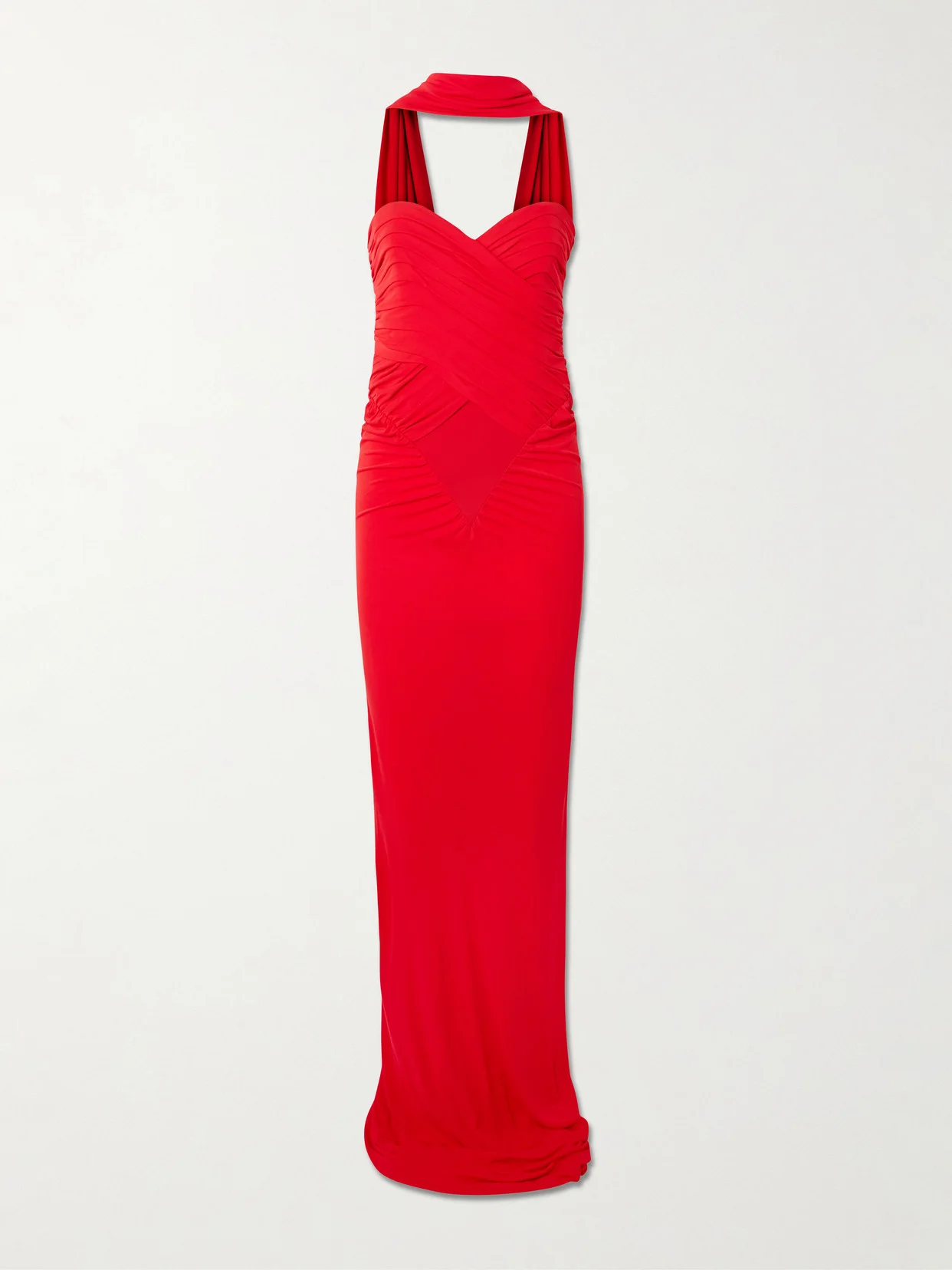 The New Arrivals Ilkyaz Ozel's 'Samsara' gown encapsulates the label's alluring elegance. Made from bold red jersey, it's softly gathered through the boned bodice and skims your figure all the way to the floor-sweeping hem. The halter tie perfectly frames the sweetheart neckline.