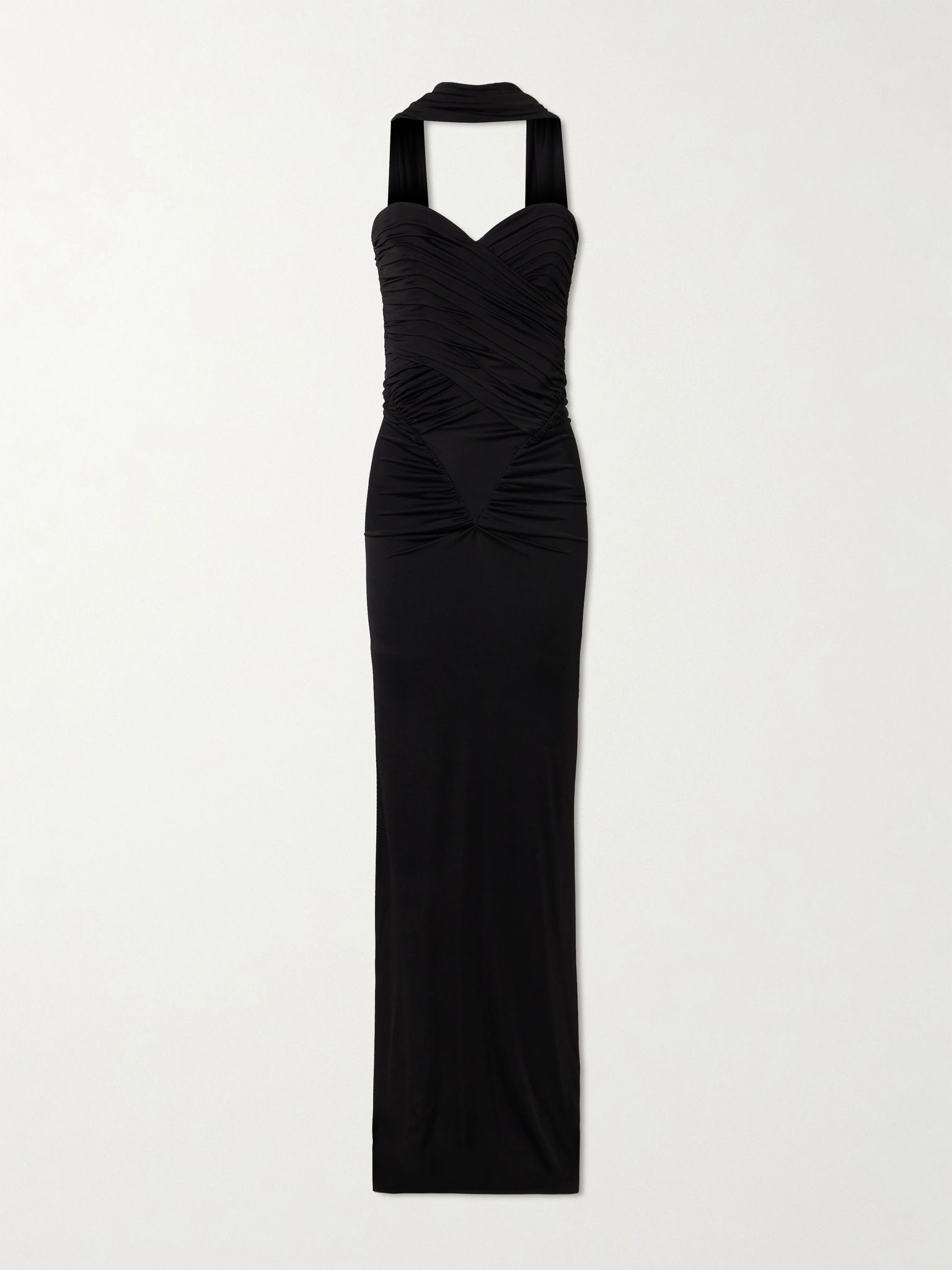 The New Arrivals Ilkyaz Ozel's 'Samsara' gown is defined by gathered panels that artfully drape and wrap around the bodice. It's made from smooth stretch-satin with a strapless sweetheart neckline and falls to a pooling hem. Accessorize with chunky bangles. Size & Fit - Fits true to size, take your normal size - Designed for a very close fit - Internal bodice for support - Particularly long in length - Mid-weight, stretchy fabric - Model is 177cm/ 5'11" and is wearing a FR 36 Model measurements: - Bust: 80cm/ 31.5" - Waist: 65cm/ 25.5" - Hip: 89cm/ 35" Details & Care - Black stretch-satin - Concealed zip fastening along back - 97% viscose, 3% elastane - Unlined - Dry clean - Designer color: Dark Side
