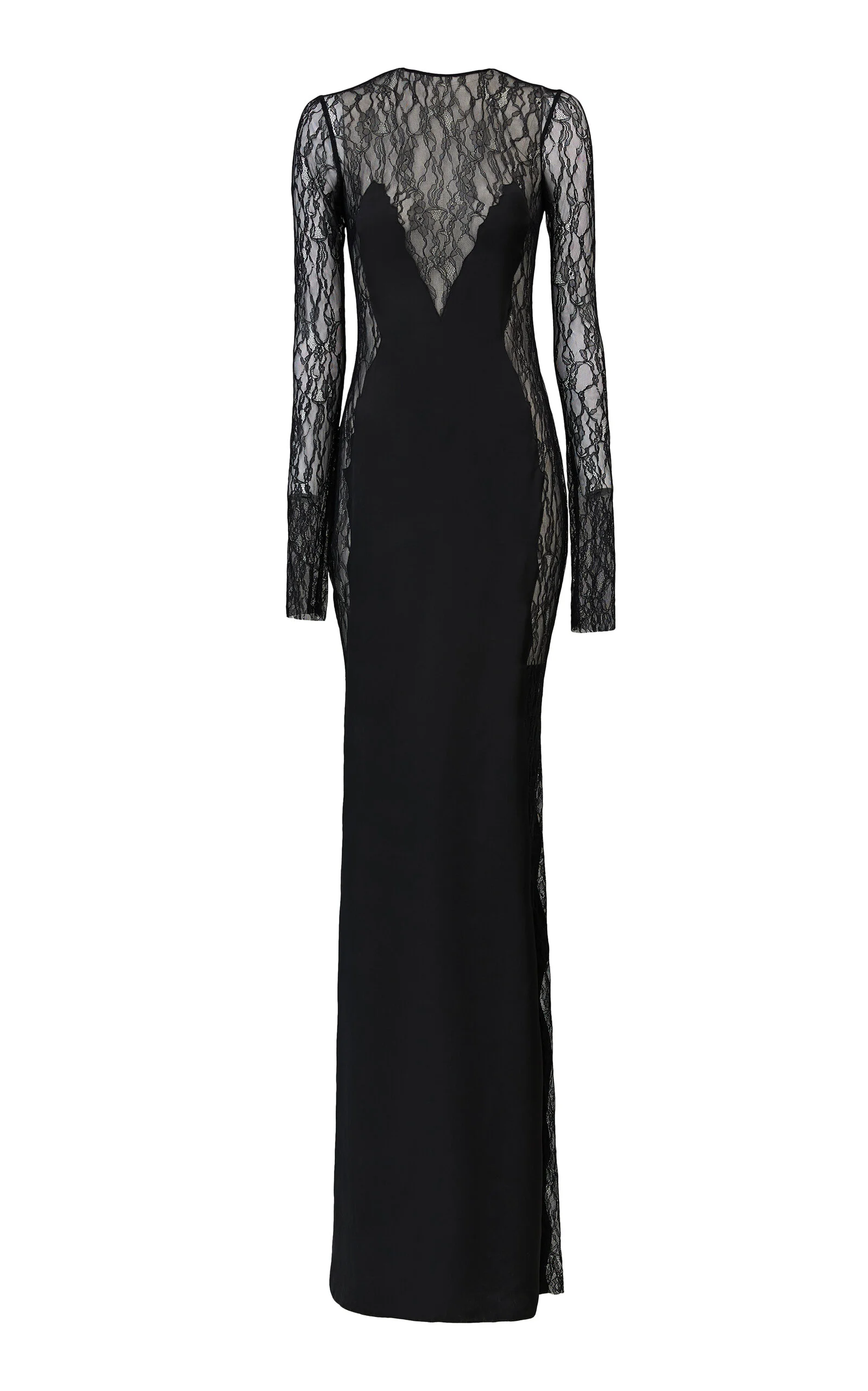 PRODUCT DETAILS - Slim fit, rounded neckline with long sleeves, laced detailing by the shoulder and sleeves, column silhouette maxi - Zip Fastening Through Back - Composition: 100% POLYESTER - Color: Black - Dry Clean Only - Fall-Winter '25