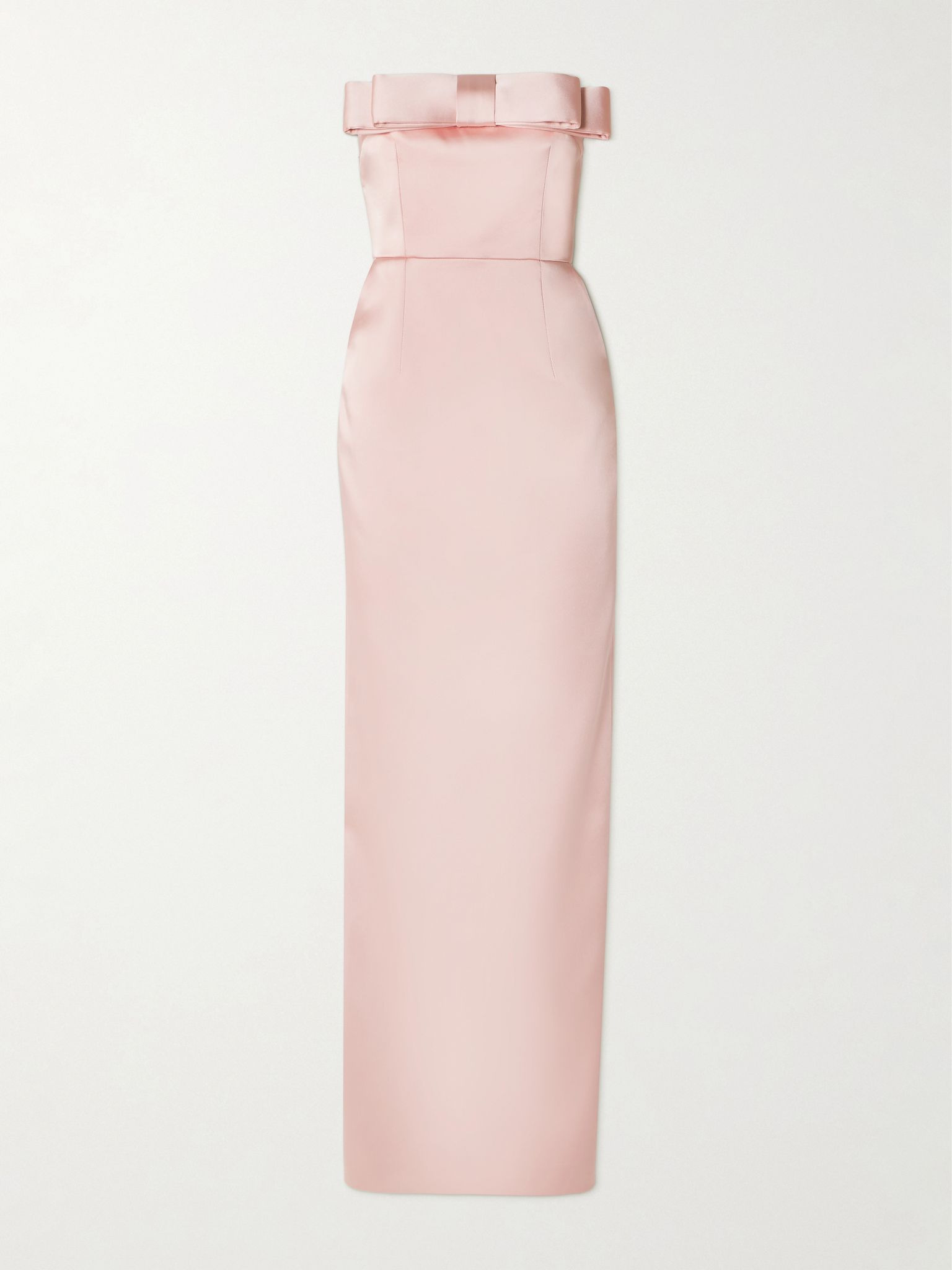 The New Arrivals Ilkyaz Ozel's 'Sisu' gown is a vision of refined sophistication. Crafted from smooth satin, it has a strapless, form-fitting bodice detailed with a sizable bow and falls to a streamlined, column-shaped skirt. Complement the delicate 'Boise de Rose' shade with a tonal lip and blush. Size & Fit - Fits true to size, take your normal size - Designed for a close fit - Mid-weight, non-stretchy fabric - Model is 177cm/ 5'11" and is wearing a FR 36 Model measurements: - Bust: 80cm/ 31.5" - Waist: 65cm/ 25.5" - Hip: 89cm/ 35" Details & Care - Pink satin - Concealed zip fastening along back - 100% polyester - Fully lined - Dry clean - Designer color: Bois de Rose