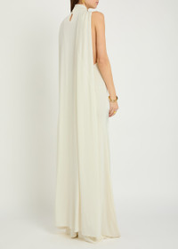 Info & Care The New Arrivals stretch-jersey gown High halterneck with twist detail, asymmetric cape with trim detailing, low back, fully lined Concealed hook and zip fastening at back 97% viscose, 3% elastane Dry clean Size & Fit Length shoulder to hem: 65 inches/ 165cm Midweight Slim fit, loose at hem Model is 5'9"/ 175cm and wears a size small