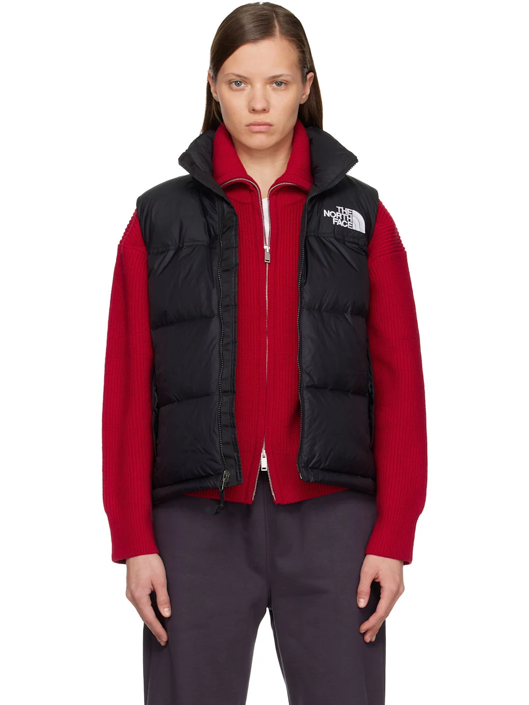Packable down-filled and quilted recycled nylon ripstop vest. · Water-repellent, non-PFC DWR coating · Recycled down · Stowaway hood at funnel neck · Bungee-style drawstring at hood · Zip closure · Logo embroidered at chest and back · Zip pockets at front · Concealed bungee-style drawstring at hem · Zip pocket at interior · Full taffeta lining Supplier color: TNF black/Recycled down Body: 100% nylon. Fill: 80% recycled down, 20% recycled waterfowl feathers. Lining: 100% nylon. Made in Bangladesh 252802F068011