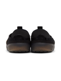 Paneled recycled P.E.T. mesh and canvas mules in black. · Pull-loop at collar · Logo bonded in white at outer side · Elasticized trim at heel tab · Locker-loop at heel counter · Mesh lining · Textured EVA foam rubber footbed · Grosgrain webbing trim at welt · Translucent rubber midsole · Treaded rubber outsole · Contrast stitching in tan Supplier color: TNF black