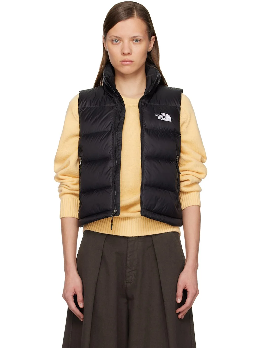 Down-filled and quilted Hydrenalite™ recycled nylon taffeta vest. · Water-repellent, non-PFC DWR coating · Recycled down · Stand collar · Zip closure · Logo embroidered at chest and back · Zip pockets at front · Concealed bungee-style drawstring at hem · Full taffeta lining Supplier color: TNF black Body: 100% nylon. Fill 1: 75% recycled down, 25% recycled waterfowl feathers. Fill 2: 100% polyester. Lining: 100% polyester. Made in Viet Nam 252802F068014