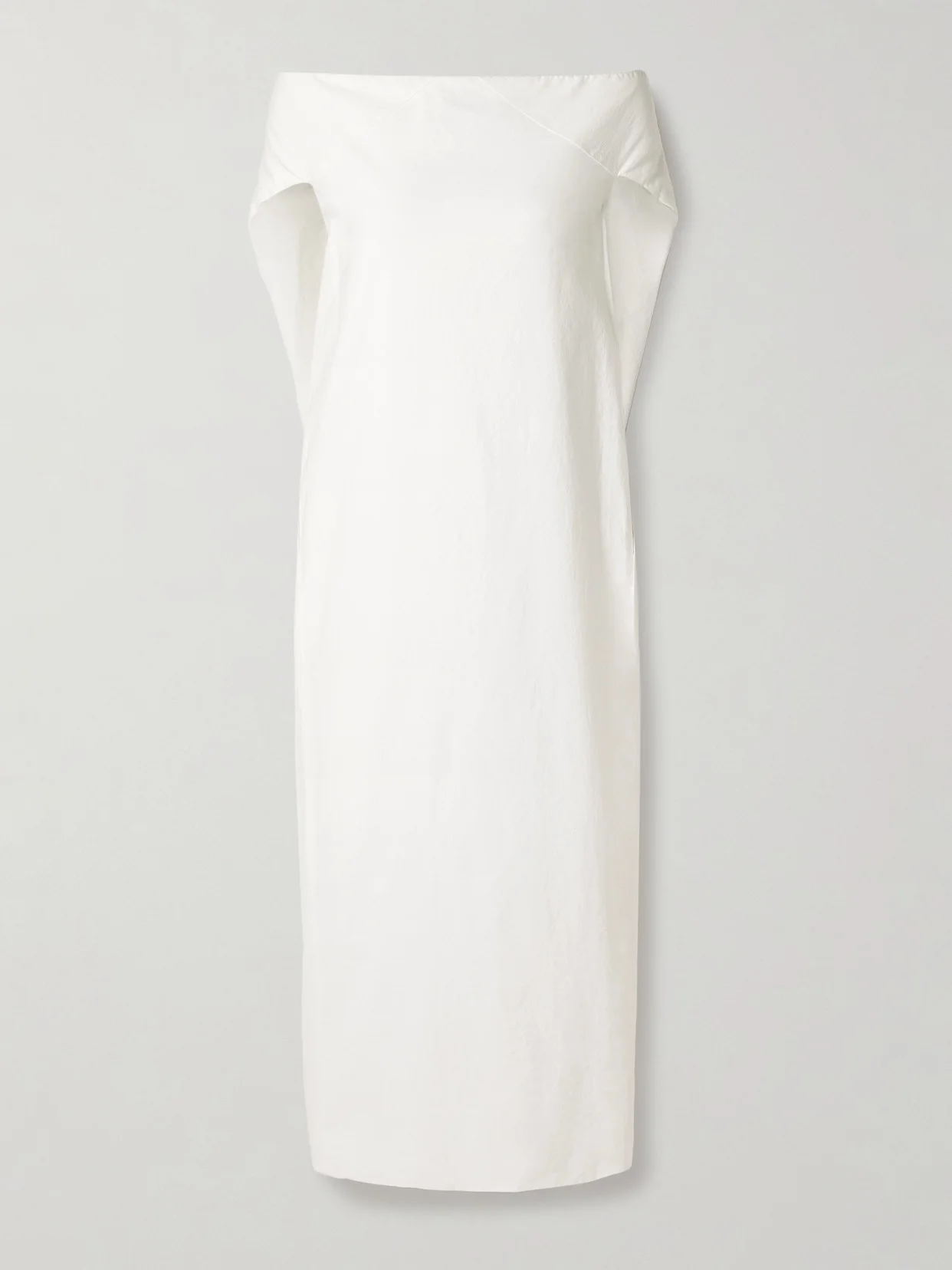 The Row's 'Anitas' dress is designed with a draped, cape-effect back, giving it a distinct shape and sculptural effect. Meant to sit elegantly off the shoulders, it's been made in Italy from cotton-poplin that gently holds its shape and has a relaxed fit.