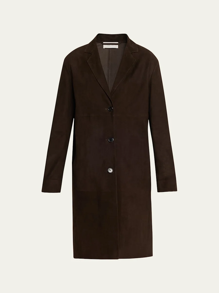 THE ROW "Babilonia" coat in suede Notch lapels; singlebreasted front Long sleeves Selftie belted waist Hip split poses Straight fit Hem falls below the knee Button closure Leather Made in Italy