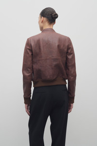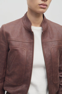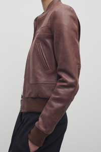 Fitted aviator jacket in tumbled lambskin leather with front besom patch pockets, ribbed cuffs and hem, and center front zip closure. More information - 100% Lambskin Leather - Lined in 100% Viscose - Made in Italy - Style: 8891L313BRO
