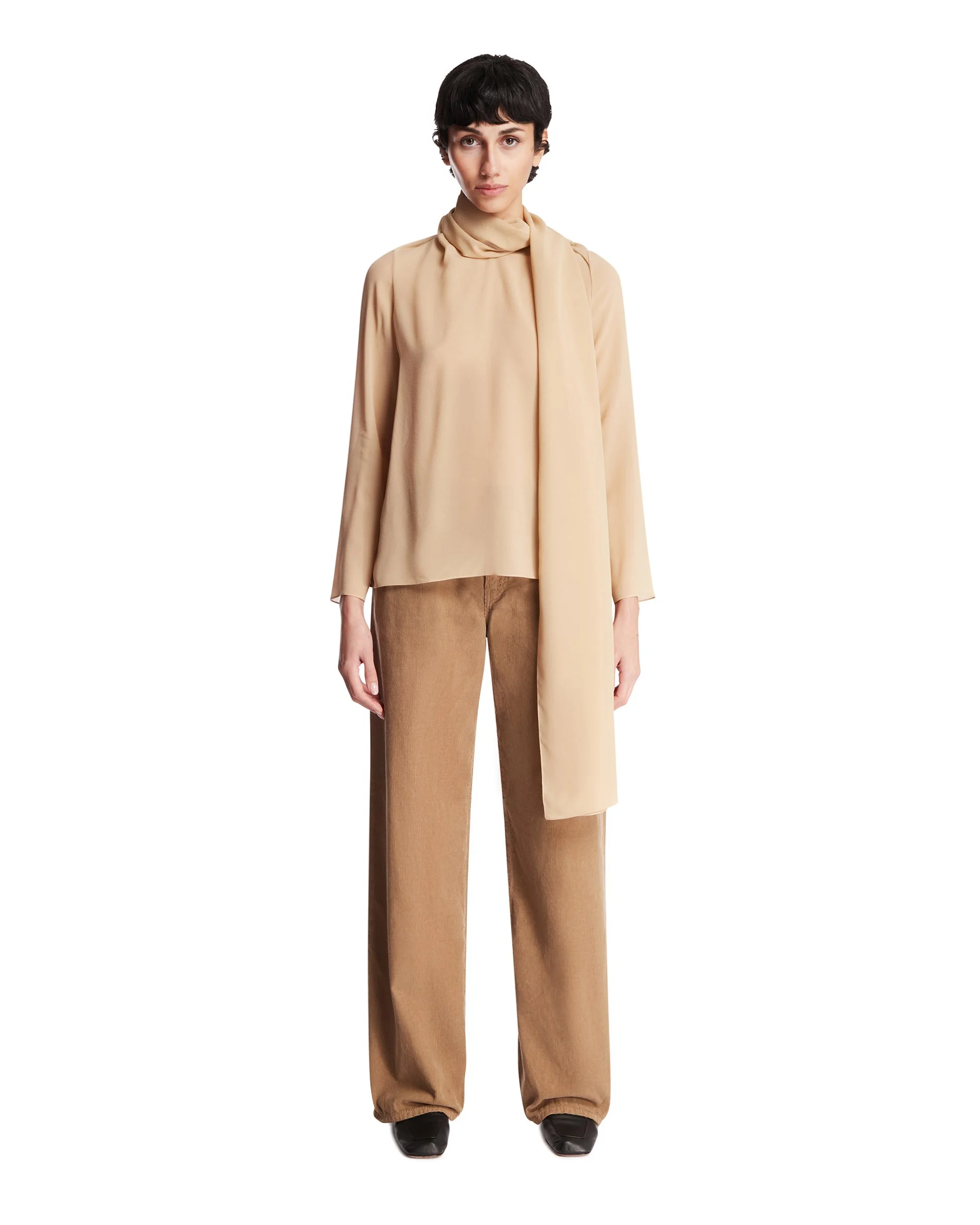 The Row Beige Silk Shirt. Beige silk, long sleeves, scarf collar, relaxed fit. Anis is 178 cm and she is wearing size 4. DETAILS Model: 10445W4205MSH Composition: 100% Silk Made in: ITALY Season: FW25-26