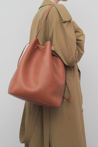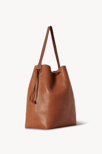 Classic tote bag in polished saddle leather with raw edge construction, drawstring closure with topstitching, and flat handle. More information - 12 x 14.75 x 7 in. - 100% Calfskin Leather - Lined in 100% Leather - Made in Italy - Style: W1664L72BRG