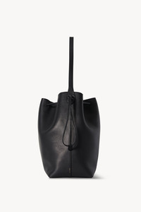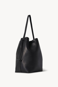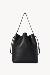 Classic tote bag in polished saddle leather with raw edge construction, drawstring closure with topstitching, and flat handle. More information - 12 x 14.75 x 7 in. - 100% Calfskin Leather - Lined in 100% Leather - Made in Italy - Style: W1664L72BLSG