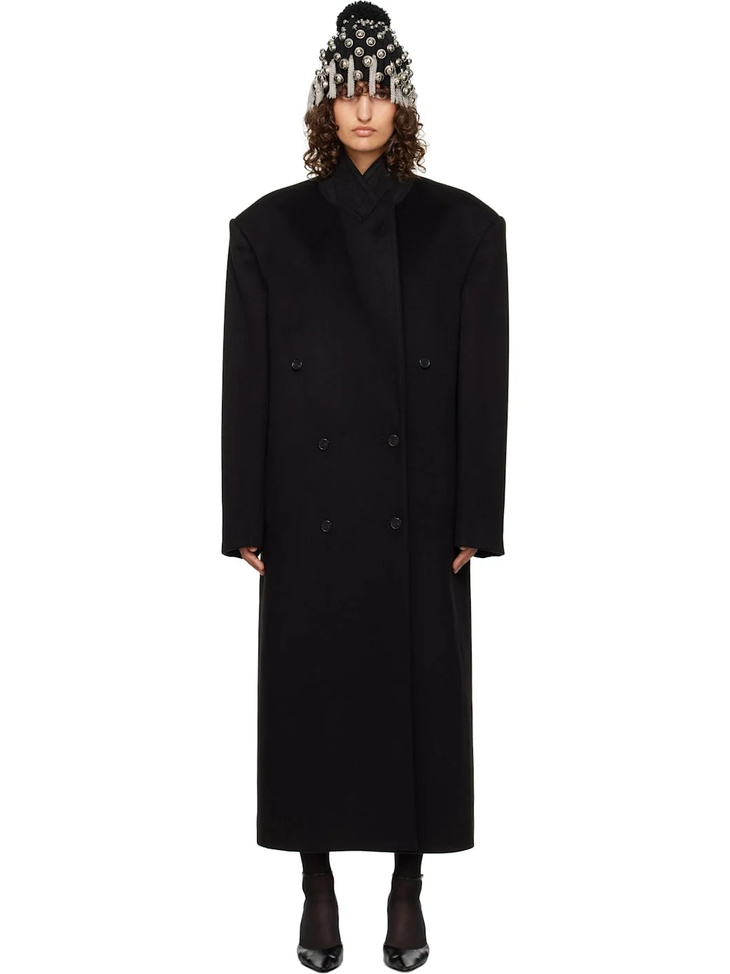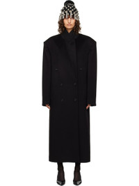 Double-faced recycled cashmere- and wool-blend melton coat. · Heavyweight · Peaked lapel · Double-breasted button closure · Seam pockets · Padded shoulders · Central vent at back hem · Welt pocket at interior · Full silk habotai lining · Horn hardware Supplier color: Black Body: 50% recycled cashmere, 45% cashmere, 5% wool. Lining: 100% silk. Made in Italy 251359F059008