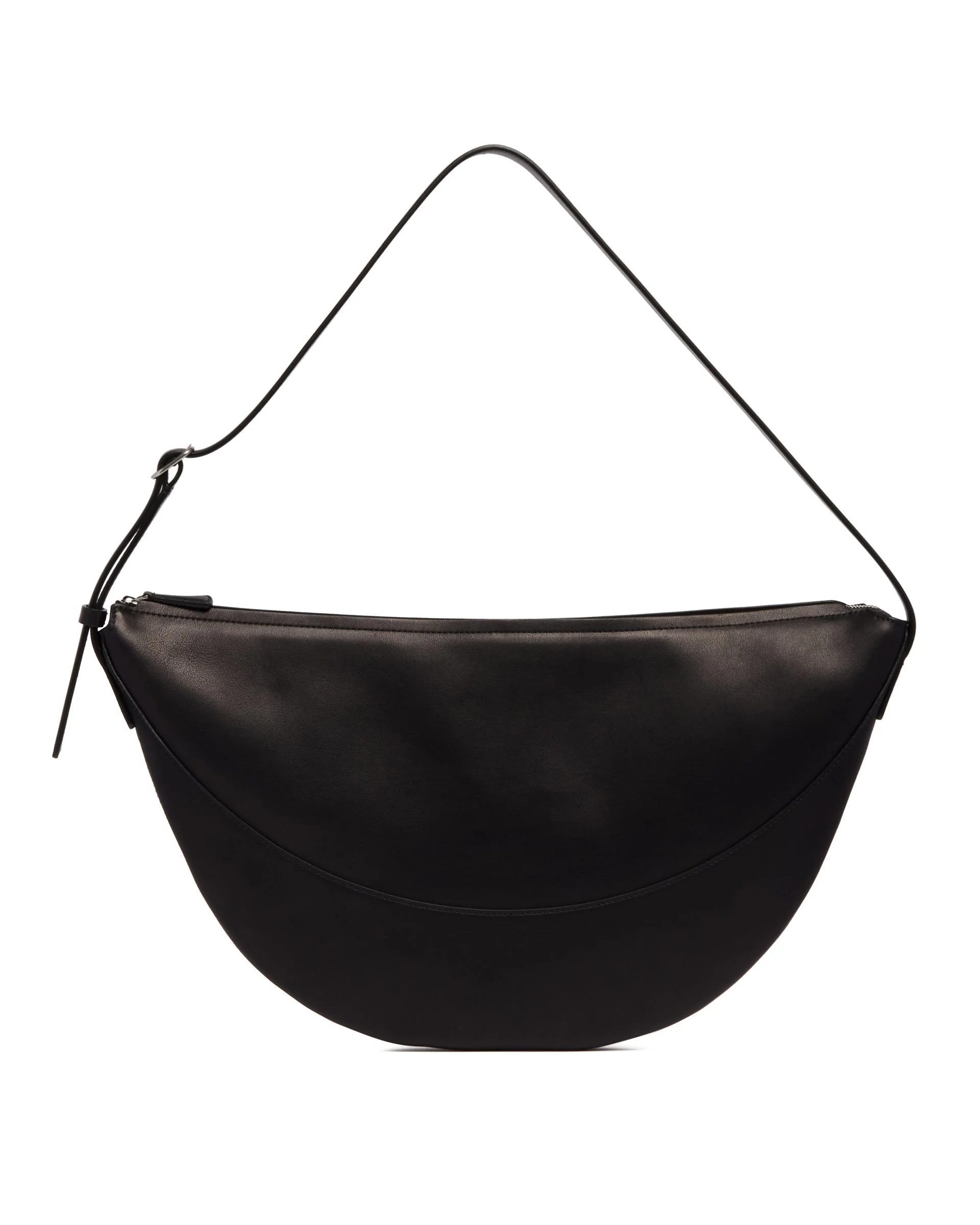 The Row Black Jouve Leather Bag. Black smooth, lightweight black nappa leather, crescent-shaped design, zip closure, adjustable shoulder strap with metal buckle. Leather lining, silver-tone hardware. Size (cm): 20X25X2 DETAILS Model: W1772L72BAS Composition: 100% Leather Made in: ITALY Season: SS25