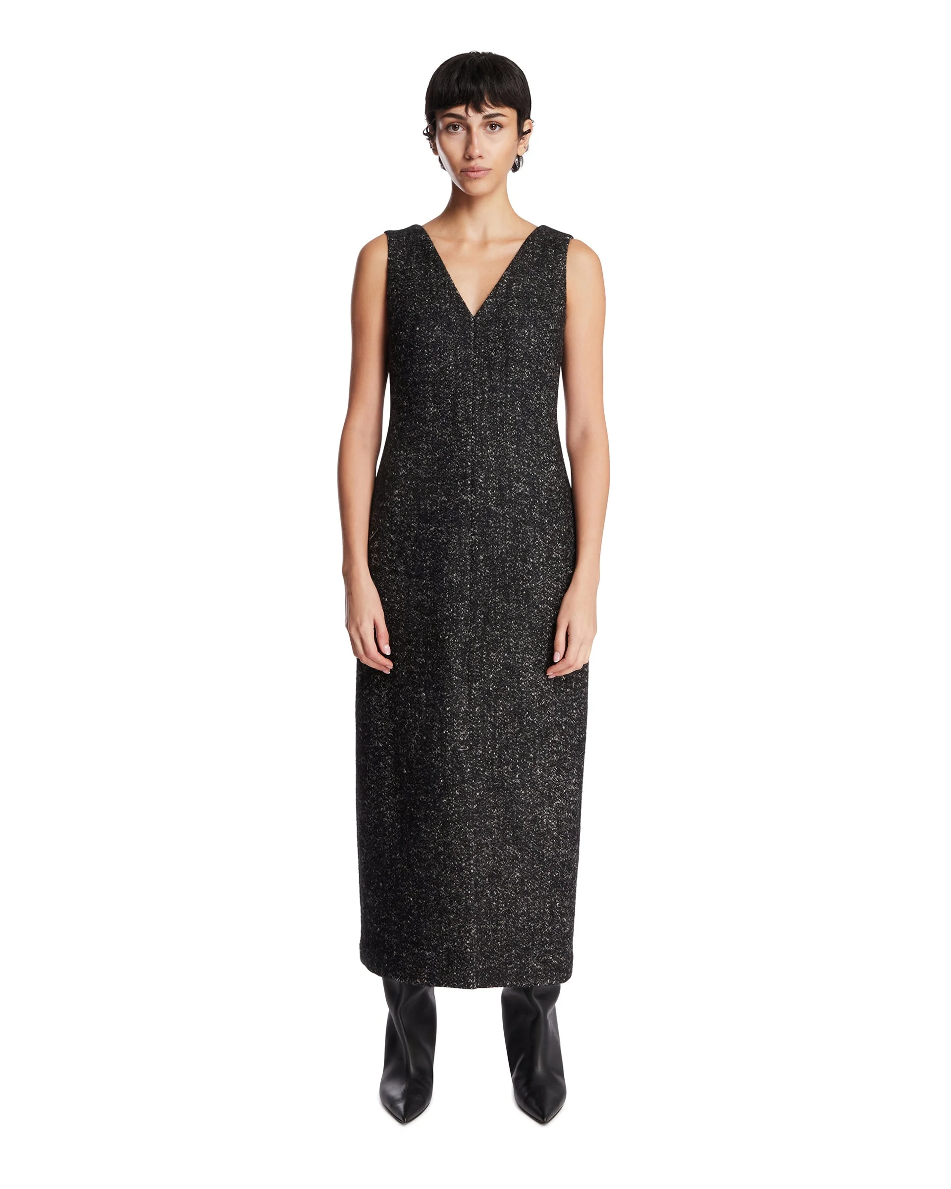 The Row Black Wool Midi Dress. Black wool with a melange effect, sleeveless, V-neckline, midi length, silk lining. Back zip closure. Anis is 178 cm and she is wearing size 4. DETAILS Model: 10528W4216BLK Composition: 100% Wool; Lining: 100% Silk Made in: ITALY Season: FW25-26