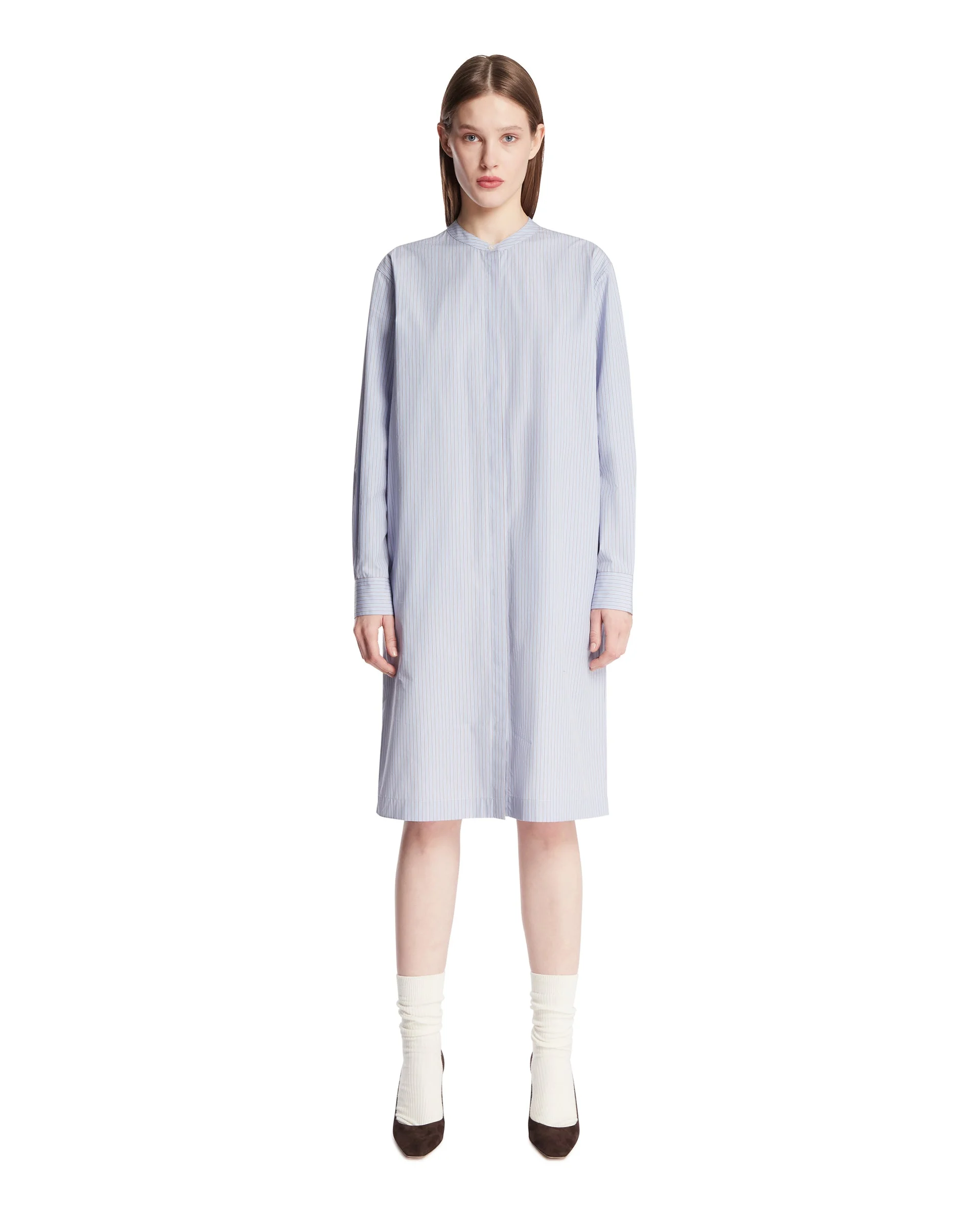The Row Blue Cotton Chemisier Dress. Blue cotton with vertical stripes, mandarin collar, long sleeves. Hidden front closure, straight hem. Relaxed fit. Vika is 180 cm and she is wearing size 4. DETAILS Model: 10794W4448LVB Composition: 100% Cotton Made in: ITALY Season: SS26