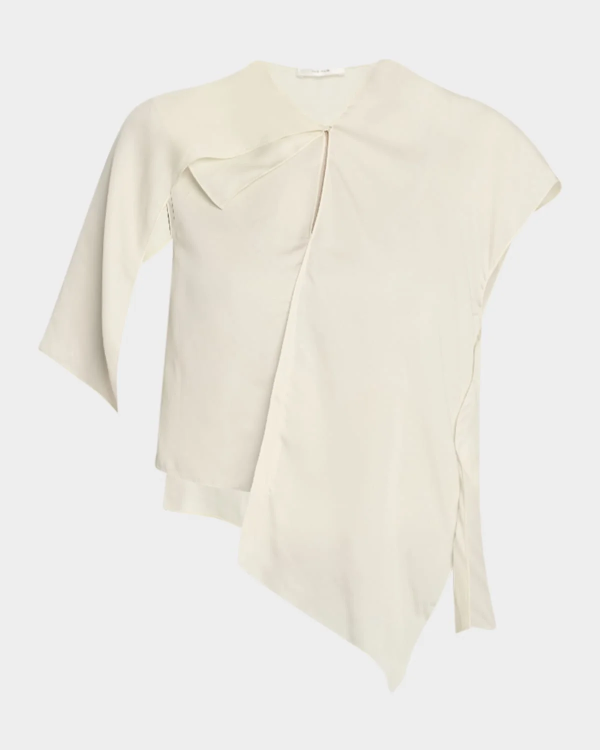 - THE ROW "Doss" top featuring asymmetric panel drapes - V neckline; hook/keyhole front - Sleeveless - Relaxed fit - Pullover style - Cupro - Made in Italy