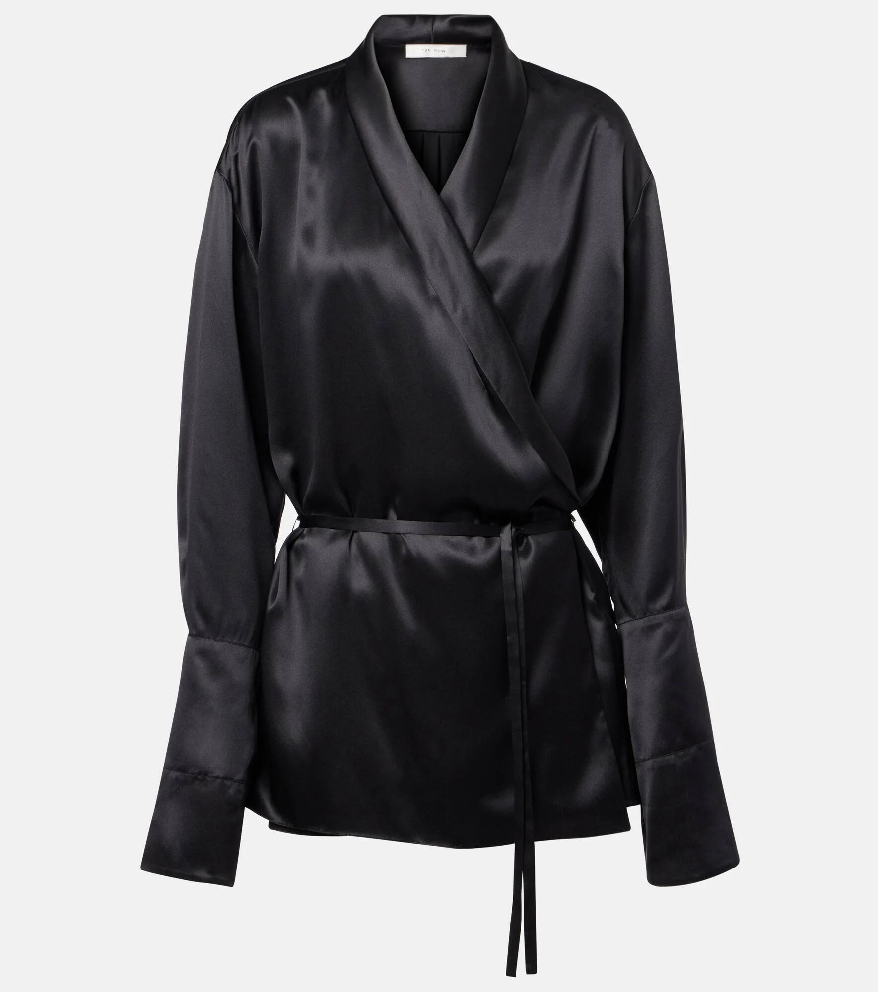 A deep affection for refined and timeless fashion influences The Row's dedication to craftsmanship and quality. The Eivie wrap top is made from pure silk satin. Product Details - Material: 100% silk - Care instructions: dry clean - Made in Italy - Designer color name: Black - Item color: black - Cuff: three buttons - Closure: buttoned front - Self-tie belt - Item number: P01076675 Size & Fit - True to size - Dropped shoulders - Loose fit, comes with belt - Non-stretchy fabric - Falls below the hip - The model seen in the picture is 178cm-5'10" and wearing a size US 4