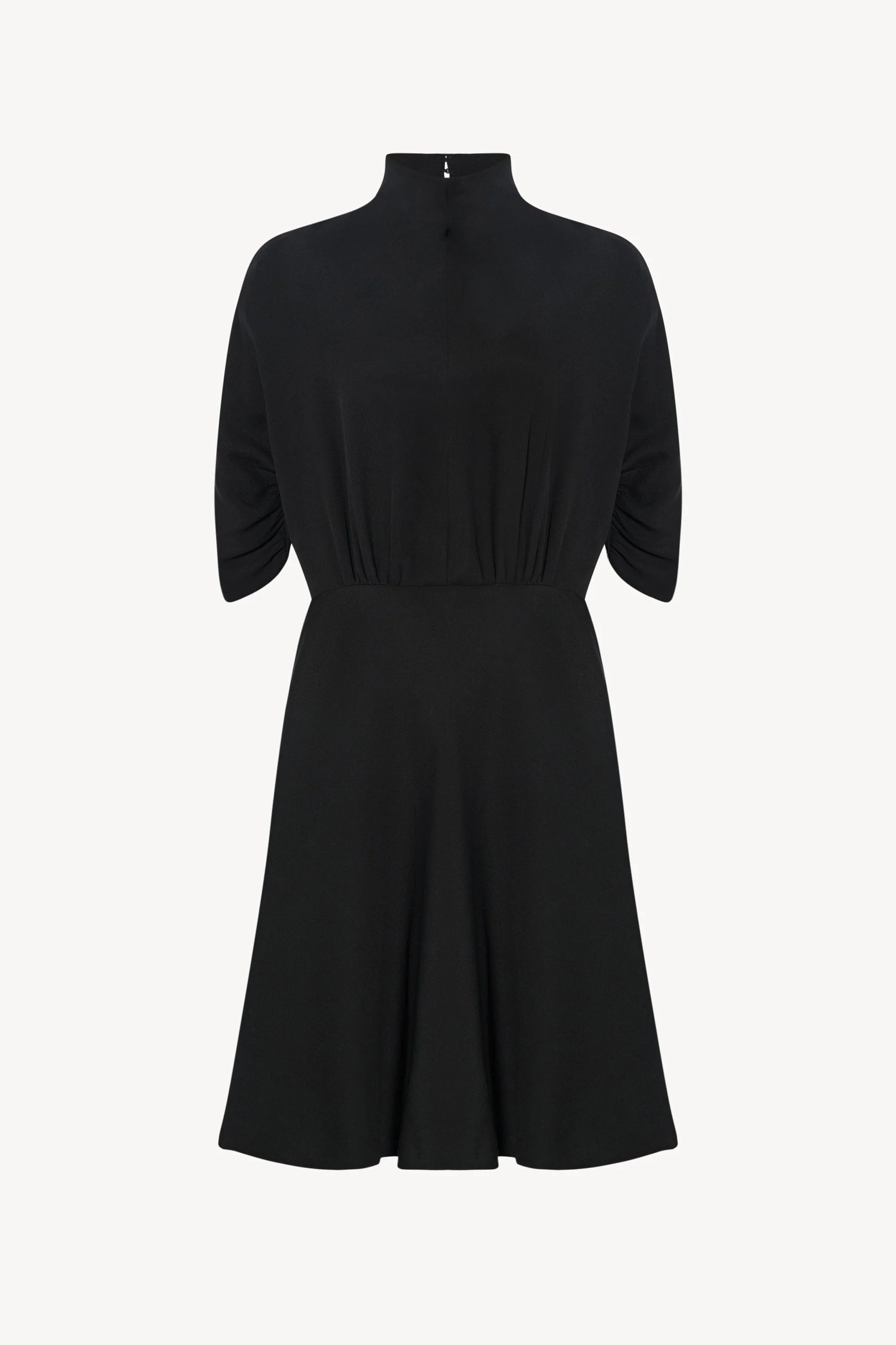 Flared calf-length dress in silk crepe cady with high funnel neckline, fitted waist, elbow-length dolman sleeves with gathered detailing, and concealed back zipper closure with hook & eye at neckline. Characterized by a distinctive pebbled surface and fluid drape, this fabric offers a soft, matte hand and refined feel. More information - 100% Silk - Unlined - Made in Italy - Style: 10785W4335BLK