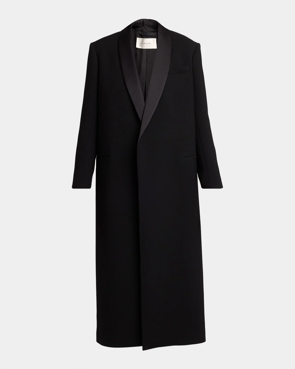 THE ROW "Erdene" coat is tailored with silk satin lapels Shawl collar; singlebreasted front Long sleeves Padded shoulders Chest welt pocket Hip welt pockets Straight fit Hem falls below the knee Walking vent back Wool/silk Made in Italy