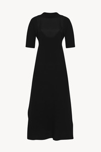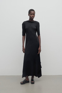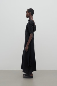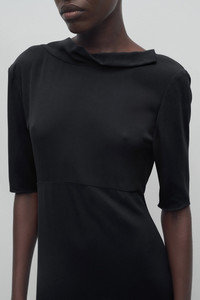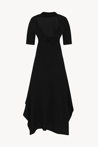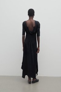 Minimal calf-length dress in crisp silk georgette with three-quarter-length sleeves, folded drape detail at back, and asymmetrically draped side slits at hem. More information - 100% Silk - Made in Italy - Style: 8870W3648BLK