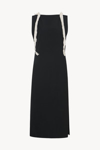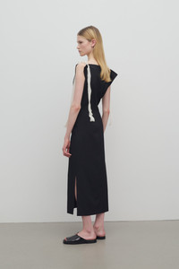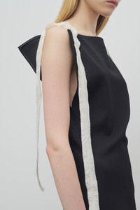 Calf-length column dress in structured virgin wool with straight neckline, side slit, and contrasting ribbons in featherlight organza at each shoulder. More information - 100% Virgin Wool - Made in Italy - Style: 8868W3601BLK