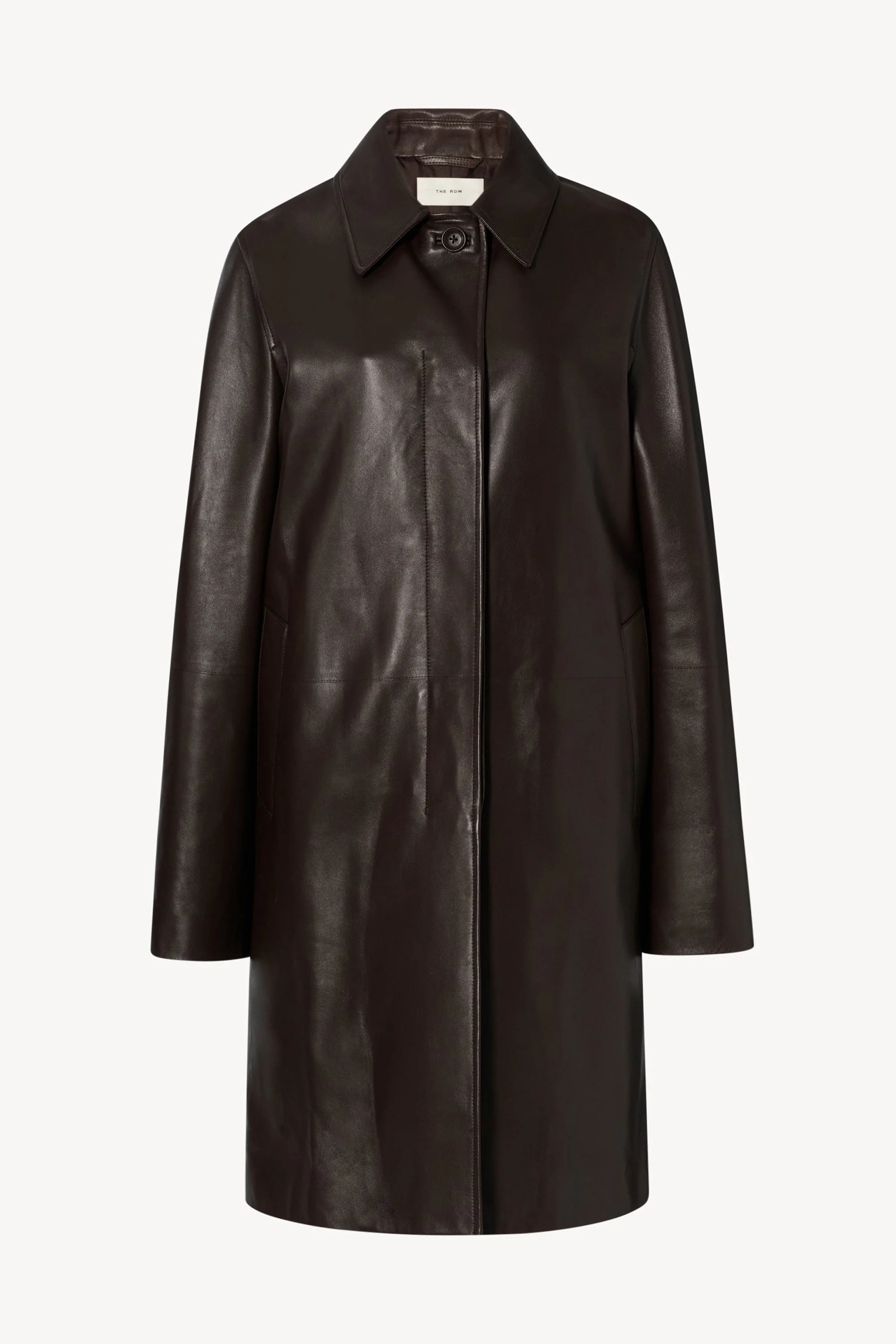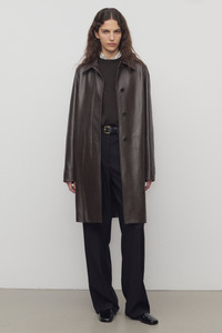 Knee-length car coat in supple nappa leather with wide, notched collar, slant side pockets, and concealed front placket with button closure. More information - 100% Lambskin Leather - Lined in 100% Silk - Made in Italy - Style: 10283L325BRO