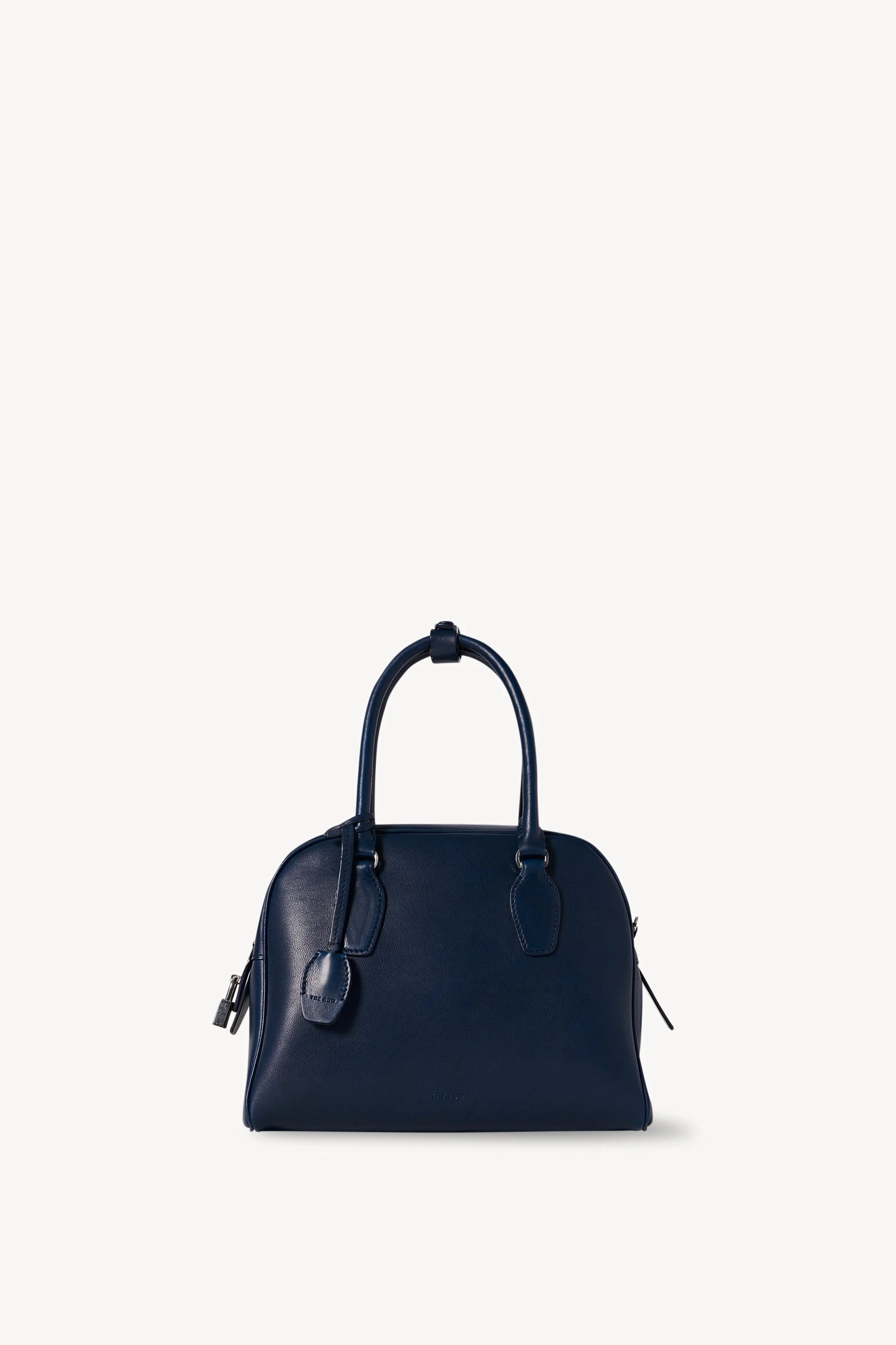 Updated bowling bag in polished saddle leather with tubular handles, branded metal padlock and key, and zipper closure. More information - 9.5 x 7.5 x 3.15 in. - Detachable adjustable crossbody strap - 100% Calfskin Leather - Lined in 100% Leather - Made in Italy - Style: W1734L72BLNGA