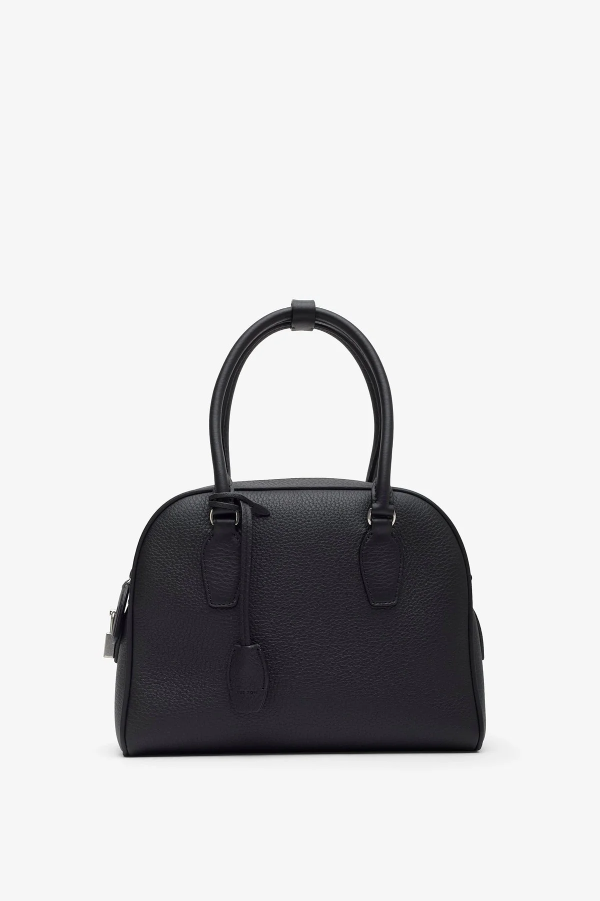 Black leather top-handle bag from The Row. The India top-handle bag is made in textured calfskin leather with tubular handles, branded metal padlock and key, and zipper closure. It is minimally finished, the natural grain surface is left intact, giving the leather a supple hand and refined texture that develops character over time. - Measurements: L24 x H19 x W9 cm - Length of handles: 39 cm - Made in Italy Product Code: W1734-L129-BAS