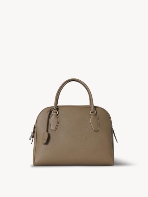 Updated bowling bag in textured calfskin leather with tubular handles, branded metal padlock and key, and zipper closure. Minimally finished, the natural grain surface is left intact, giving the leather a supple hand and refined texture that develops character over time. More information - 11.81 x 4.72 x 9.45 in. - Handle: 4.33 in. drop - Antique silver hardware finishing - 100% Calfskin Leather - Lined in 100% Lambskin Leather - Made in Italy - Style: W1595L129SMKTA
