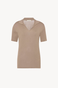 Short-sleeved polo top in fluid viscose silk with open front placket, ribbed collar, and slim fit. More information - 88% Viscose, 12% Silk - Made in Italy - Style: 8944Y913BEI