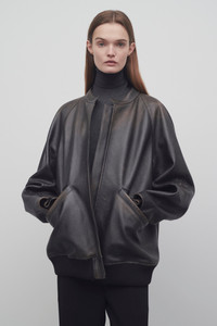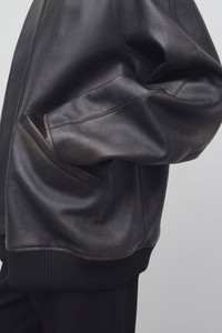 Oversized motorcycle jacket in distressed calfskin leather with stand collar, raglan sleeves, side welt pockets, and ribbed hem. More information - 100% Calfskin Leather - Lined in 100% Silk Habotai - Made in Italy - Style: 7540L241DBR