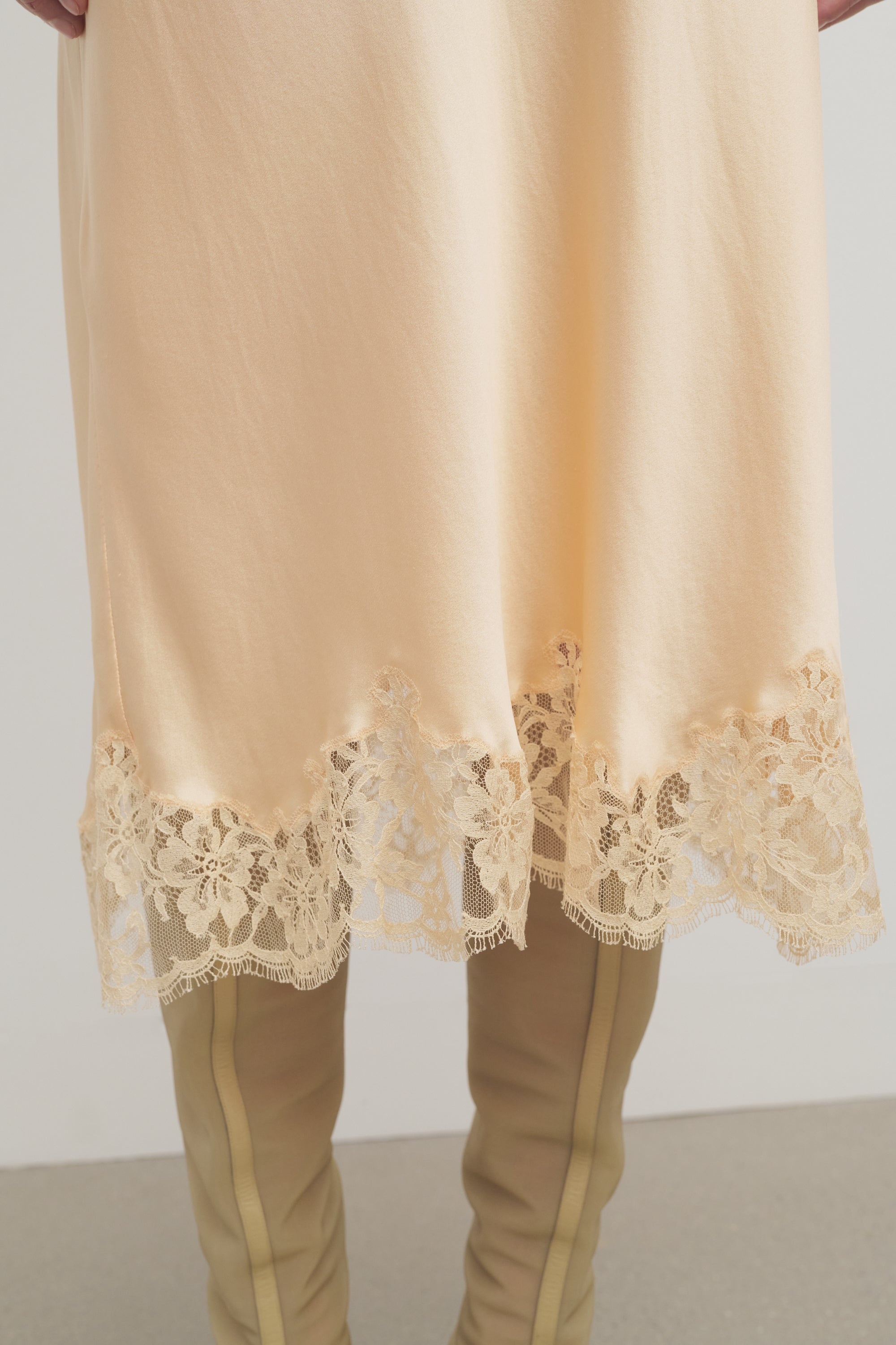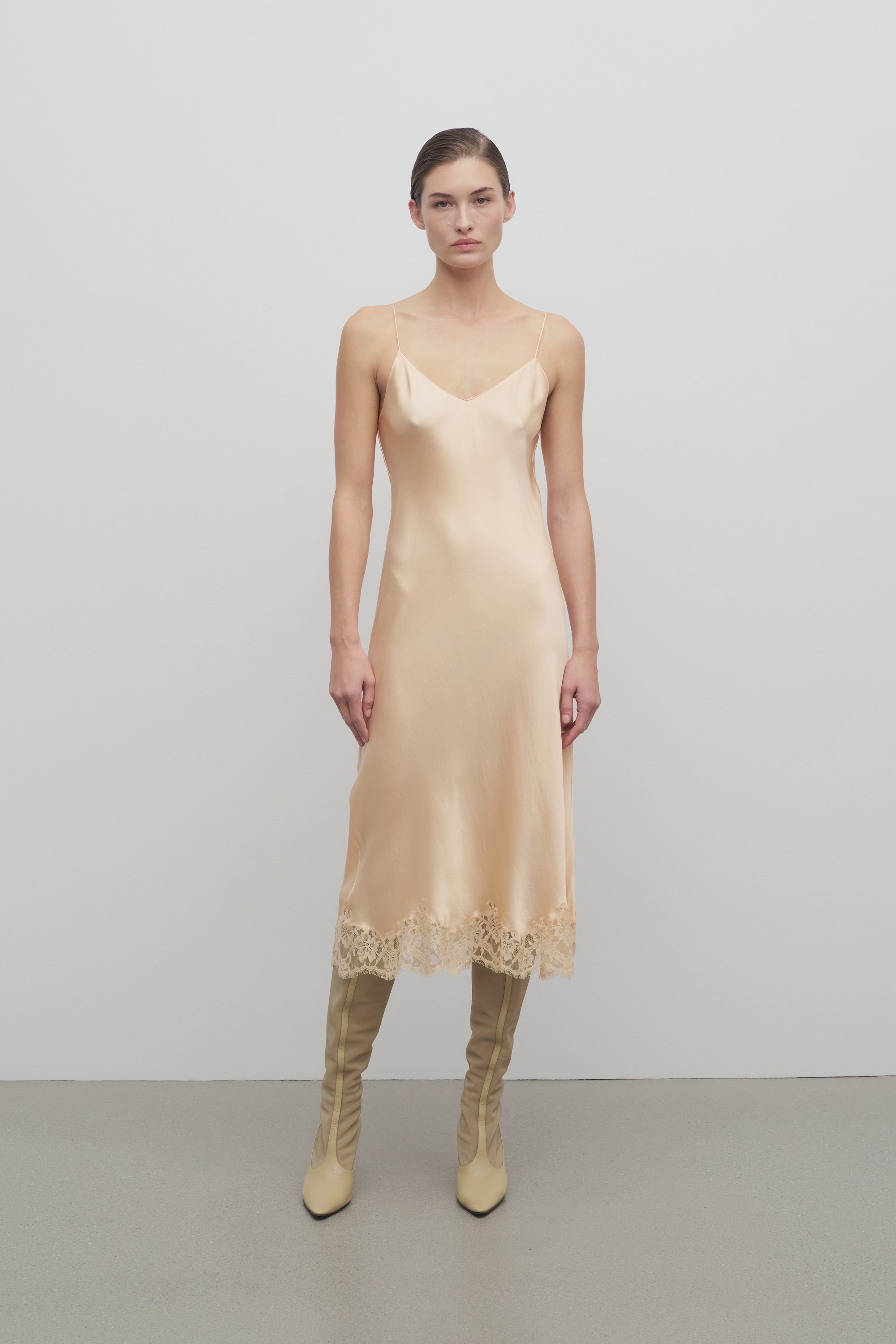 Mid-length camisole dress in bias-cut silk satin with relaxed v-neck and lace-trimmed hem.