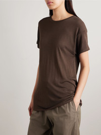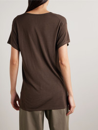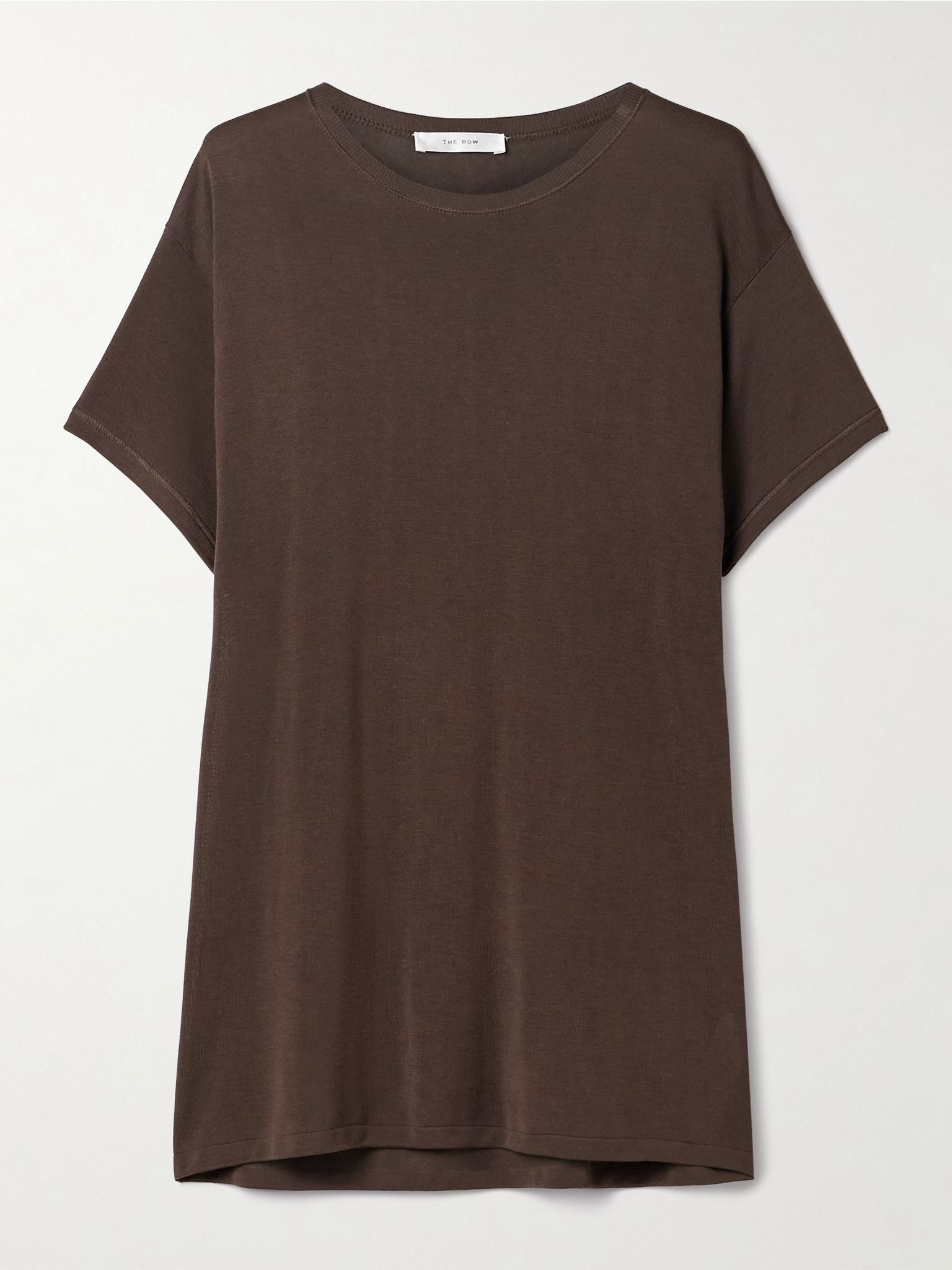 The Row is an expert when it comes to quality basics you'll reach for over and over, like this 'Kota' T-shirt. It's been made in Italy from fine jersey with a touch of silk for an even softer, fluid drape. The longline shape looks especially cool half-tucked into tailoring or jeans. Size & Fit - Fits true to size, take your normal size - Designed for a relaxed fit - Lightweight knit - Model is wearing a size Small Details & Care - Chocolate jersey - Slips on - 88% viscose, 12% silk