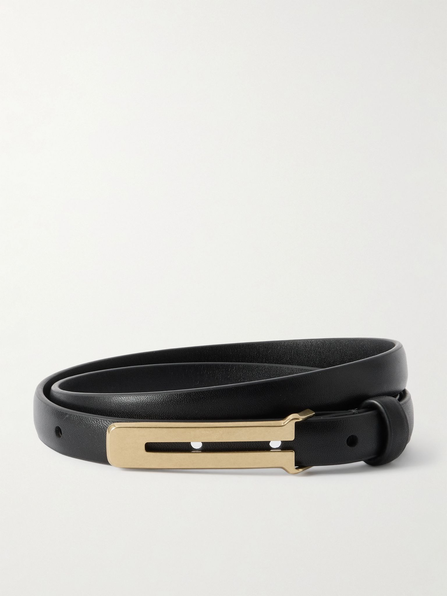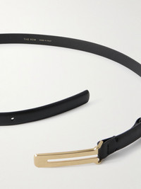 The Row's 'Kuk' belt is defined by its sleek U-shaped buckle in a gold-tone finish. It's made in a slim profile from smooth leather. Size & Fit - Designed to be worn on the hips or waist - Measurements can be found in the link below Details & Care - Black leather (Taurus) - Push stud fastening
