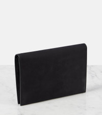 A deep affection for refined and timeless fashion influences The Row's dedication to craftsmanship and quality. This minimalist pouch will elevate any outing with its sleek design and leather construction. Product Details - Material: leather - Lining: leather - Made in Italy - Designer color name: Black Ans - Closure: snap-buttoned fastening - Hardware color: silver - Includes: dust bag - Item number: P01015840 Size & Fit - Height 14cm-5.5" - Width 21cm-8.5" - Depth 2,5cm-1"