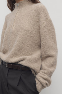 Boxy turtleneck sweater in textured alpaca and cashmere boucle with front half-zip closure, topstitched armholes, and ribbed neckline, cuffs, and hem. More information - 47% Cashmere, 31% Alpaca, 20% Silk, 1% Polyamide, 1% Elastane - Made in Italy - Style: 10067Y957BEI