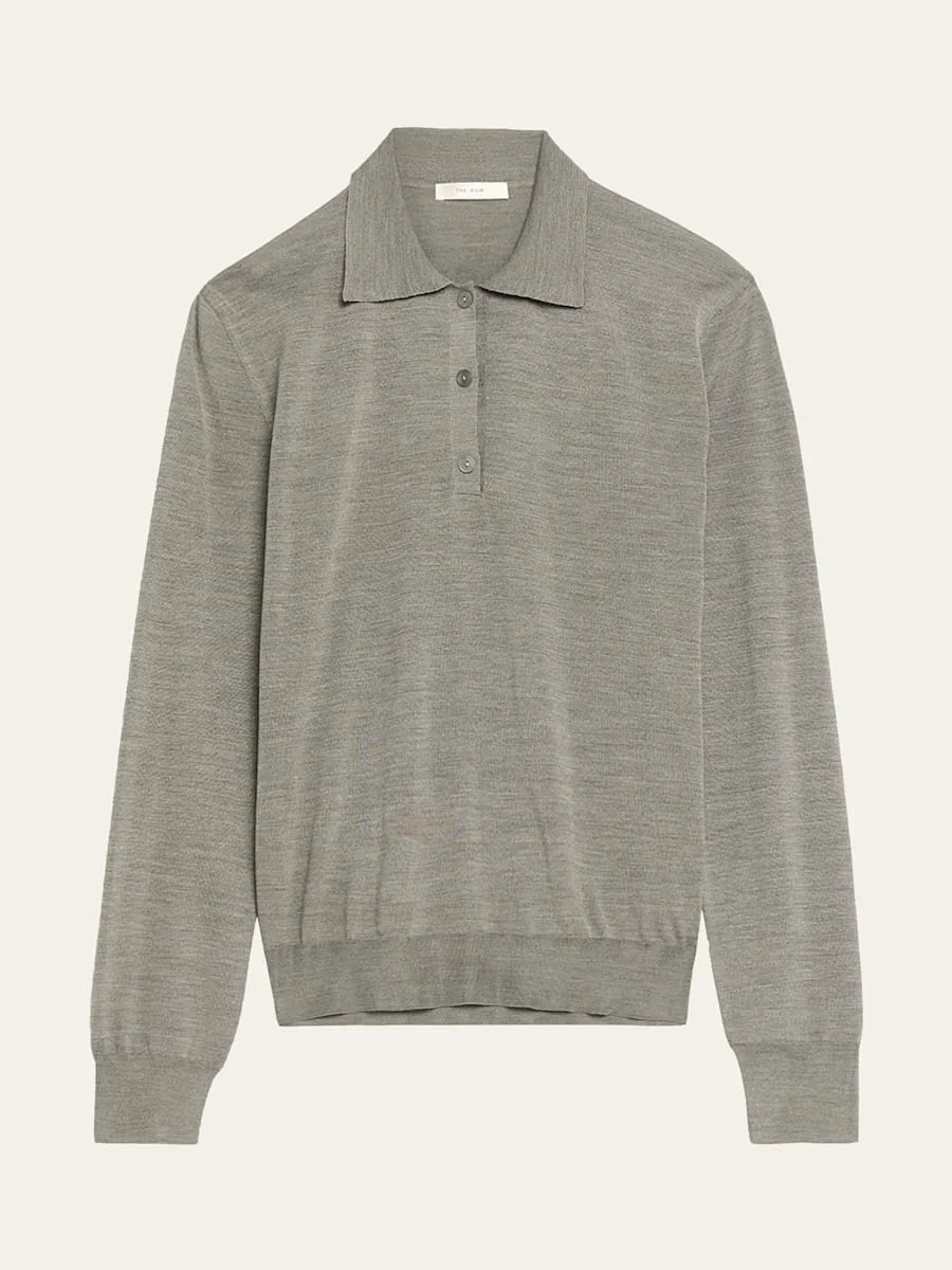 THE ROW "Lilienne" polo top in a fine silk knit Point collar; three-button front Long sleeves Relaxed fit Ribbed cuffs and hem Pullover style Silk Made in Italy Online Inquiries: BGS21_BAAQB| Store Inquiries: #5068721