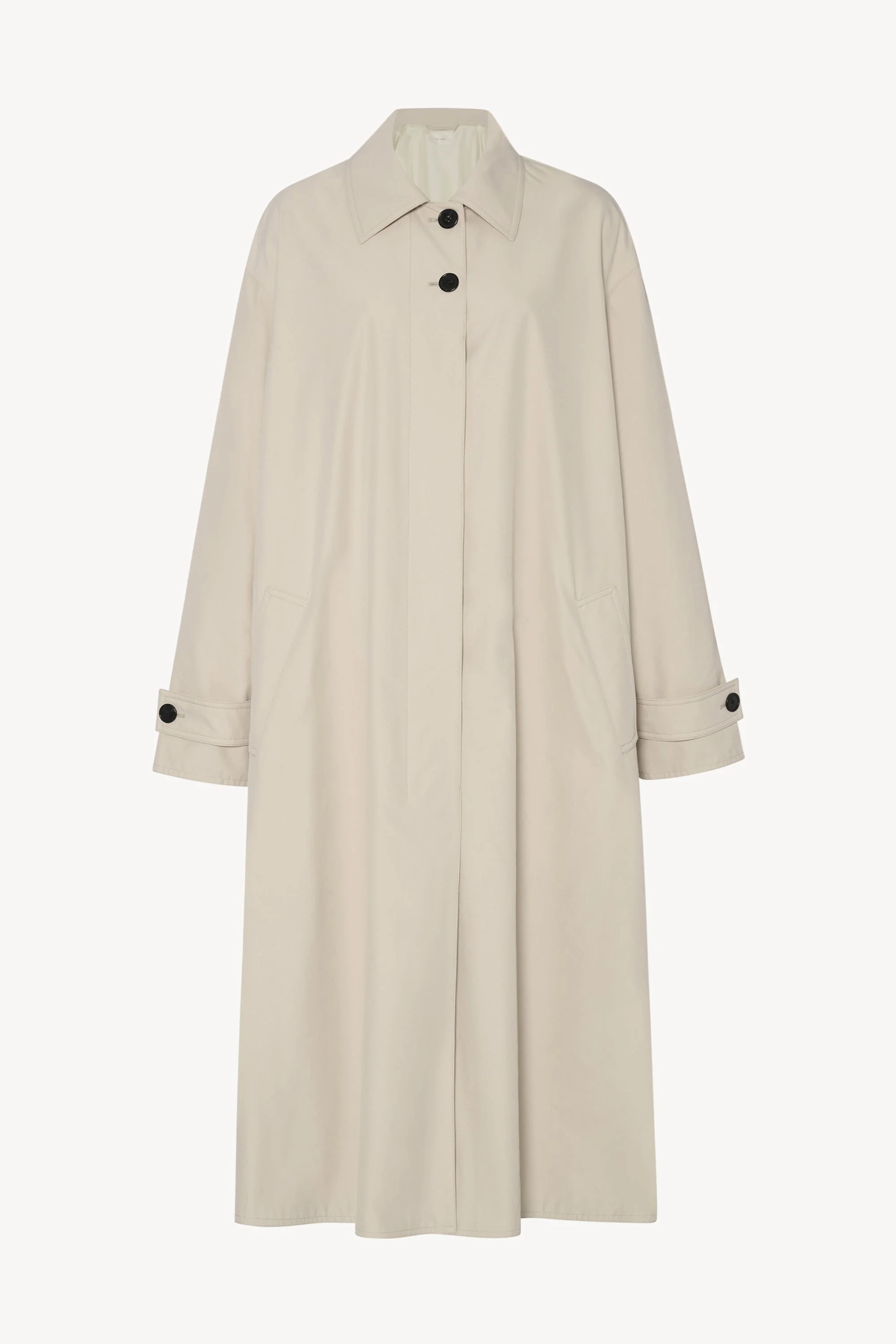 Relaxed single-breasted car coat in crisp technical cotton with mid-calf length, center back box pleat, slant welt pockets, and concealed front placket with button closure. The fabric has a smooth, clean surface with natural volume and a structured finish. More information - 60% Polyester, 40% Cotton - Lined in 100% Silk - Made in Italy - Style: 10490W4282POR