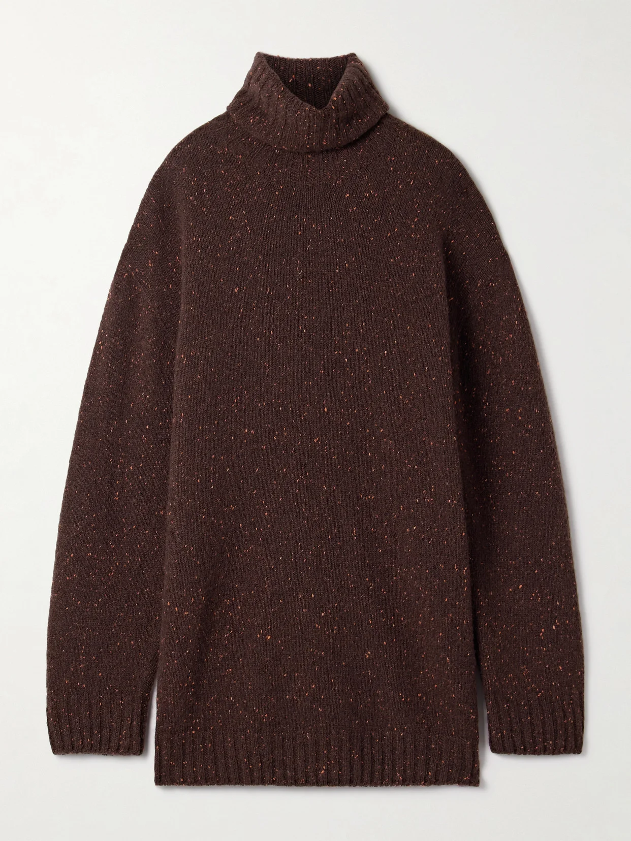 The Row delivers effortlessly cozy yet chic knitwear that will see you through the colder months. This 'Mirai' sweater is knitted from burgundy cashmere flecked with orange threads and has ribbed trims, including a slouchy turtleneck. The loose shape adds to its easy feel.