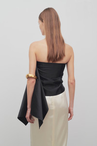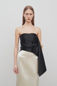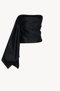 Draped bandeau top in heavy satin with long asymmetrical silhouette, handkerchief hem, interior bustier, and concealed hook closure. More information - 63% Viscose, 37% Cotton - Silk Lining - Made in Italy - Style: 8130W2994BLK