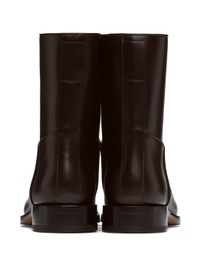 Mid-calf buffed calfskin boots in brown. · Grained leather lining · Logo stamp at padded leather footbed · Stacked leather block heel with rubber injection · Treaded leather sole · Heel: H1" Supplier color: Dark brown Upper: calfskin. Sole: leather, rubber. Made in Italy 242359F114000