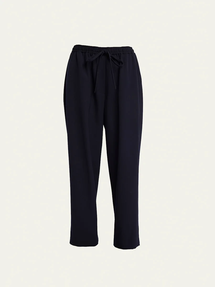 THE ROW "Orieno" pants are crafted of a wool-silk crepe featuring a drawstring waistband Mid rise sits high on hip Back patch pocket Wide legs Full length Pull-on style Wool/silk Made in Italy Online Inquiries: BGS21_BB2WY| Store Inquiries: #5470152